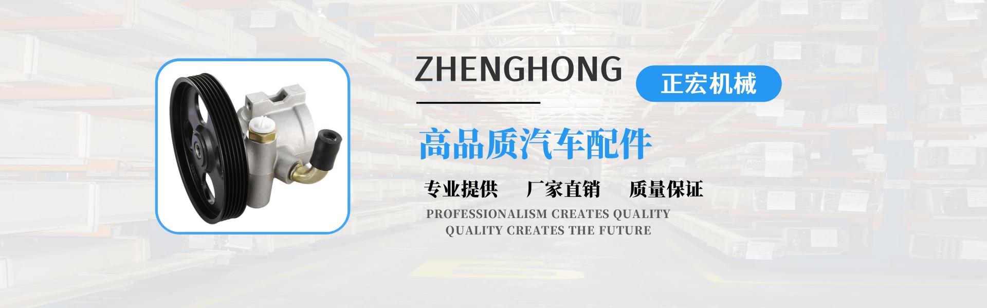 正宏機械有限公司成立于2004年,是一家新興的技術型企業,專業生產動力轉向泵。我們是一家集設計、生產、貿易于一體的專業公司,同時享有進出口權。  公司自成立以來,堅持以技術為導向,以高起點為原點;把產品創新和質量管理放在首位。擁有國內先進的汽車動力轉向泵專業生產設備和檢測設備。憑借經驗豐富的技術團隊,我們已經設計了20多個系列,近數百個動力轉向泵。年產10萬臺。產品深受廣大客戶的信賴和好評,得到了廣大客戶的認可。